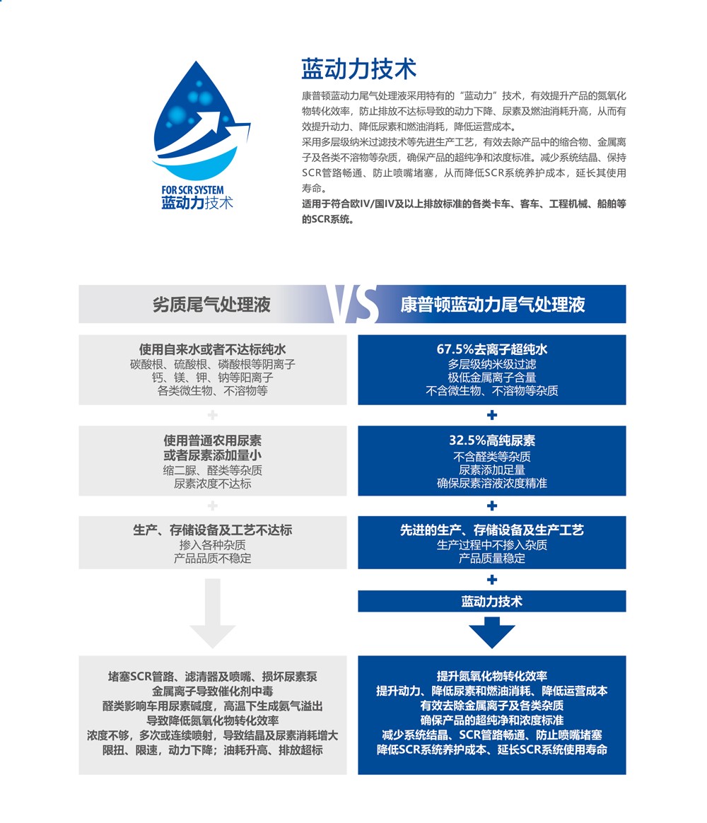 康普顿车用尿素产品于2018年正式上市,是康普顿科技获得国家CNAS实验室的山东省级研发中心的科研成果。康普顿蓝动力柴油机尾气处理液(车用尿素)采用康普顿研发的“蓝动力”技术,有效提升产品的氮氧化物转化效率,防止排放不达标导致的动力下降、尿素及燃油消耗升高,从而有效提升动力、降低尿素和燃油消耗,降低运营成本。