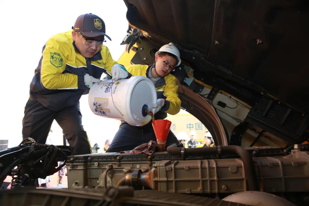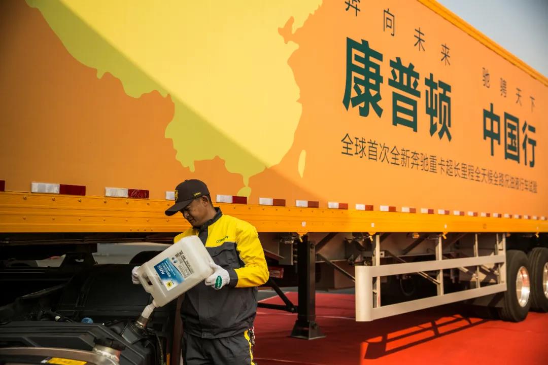 随着主持人宣布换油仪式开始,专业的重卡保养技师将全车油液放出,并更换康普顿全系油液产品。